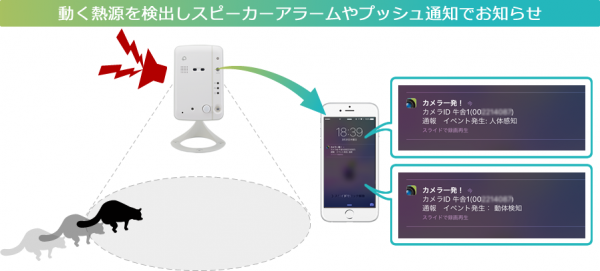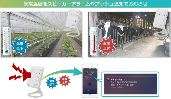 搭載した温度センサーにより、カメラ周辺の温度が設定した温度から外れるとスピーカーアラームにて周辺へ直接異常を伝えることやスマートフォンやタブレットへプッシュ通知させることが可能です。