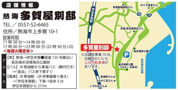 【電車】JR熱海駅(JR伊東線乗り換え)→「伊豆多賀駅」下車→徒歩3分