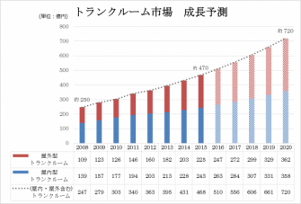 底堅い需要に支えられ、市場は依然として力強く、飛躍的な成長を続けています。今後も同等の市場拡大が続くと仮定した場合、東京オリンピックが開催される2020年には700億円を超える規模へと成長する可能性を秘めています。