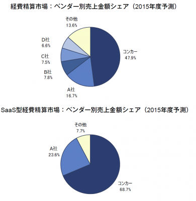 さらに、企業の売上規模別シェアでは500億円未満の中堅・中小企業において特に需要が拡大すると予測されています。「経費精算の2014年度の売上金額は28億円、前年度比22.8%増と大幅な伸びとなった。大企業中心に導入実績を拡大するコンカーが市場の伸びを牽引しているが、国産ベンダーも機能強化や積極的なマーケティング施策の推進により売上げを拡大している。市場認知度が急速に向上していることから、 2015年度も同19.3%増と引き続き高い伸びが見込まれる。」