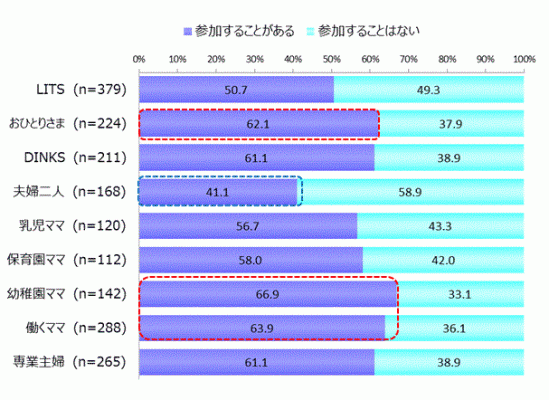 30~40代女性全体の6割弱が「参加することがある」となっています。