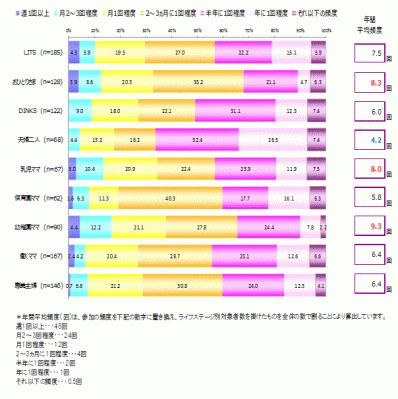 また、ライフステージ別では『幼稚園ママ』が最も多く9.3回、次いで『おひとりさま』(8.3回)、『乳児ママ』(8.0回)の順に多くなっています。