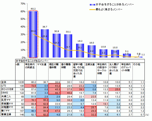 【女子会をすることがあるメンバー】では「学生時代の同級生」が最も多く60.2%となっています。 また、ライフステージ別に比較をすると、 「ママ友達」との集まりは『乳児ママ』、『保育園ママ』、『幼稚園ママ』、『働くママ』、『専業主婦』が多い。そのうち『幼稚園ママ』、『働くママ』、『専業主婦』は「主婦友達」との集まりも多くなっています。