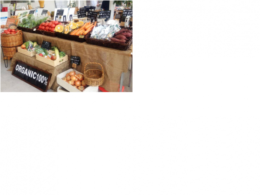 ・旬の有機野菜、有機果物、有機栽培の米、有機平飼いたまごなどの展示販売(有機新玉ねぎ、有機新じゃが芋、有機にんじん、有機スナップエンドウ、有機ごぼう、有機ほうれん草、有機パセリ、有機生姜、有機生椎茸、有機バナナ、有機甘夏など)