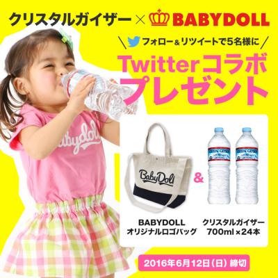 株式会社コージィコーポレーションが運営するベビー・キッズ服ブランドBABYDOLL(ベビードール)が「BABYDOLL×クリスタルガイザー」Twitterコラボプレゼント企画を6月6日(月)より開催します。