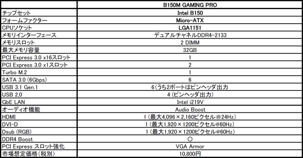 2016年4月15日-Micro-Star International Co. Ltd., 台湾・台北市- マザーボードの設計で世界をリードするMicro-Star International(MSI)は、Intel B150チップセットを採用したMicro-ATXマザーボード「B150M GAMING PRO」を、4月16日より発売いたします。本製品は、Intelの第6世代CoreプロセッサなどのLGA1151 CPUに対応したPerformance GAMINGシリーズのエントリーモデルに位置するモデルです。