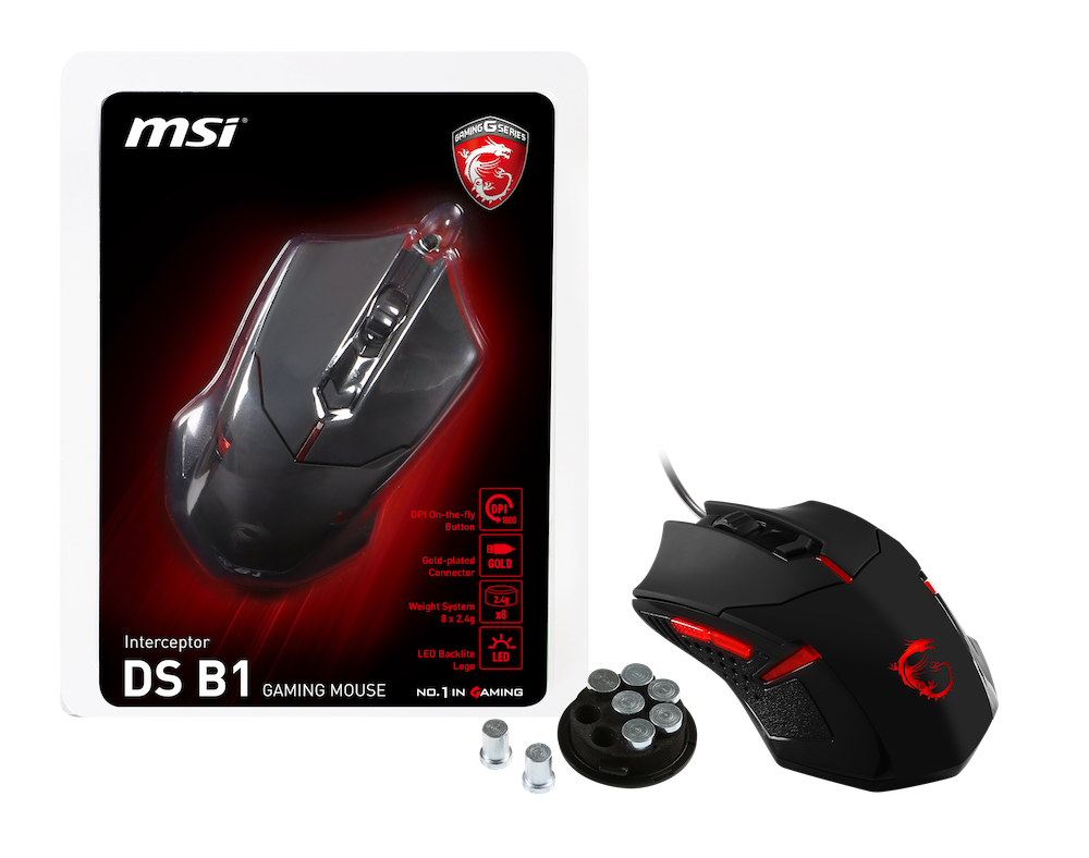 本製品に同梱される「MSI DS B1 GAMINGマウス」は、最大解像度1600dpiのオプティカルマウスで、2.4gの分銅8個によるウェイト調整機能や、複数のアクションを1クリックで実現するマウスプログラム機能を備えたゲーミングマウスです。USBコネクタに通常の3倍の金メッキを施し、抜き差しによる寿命を10倍伸ばすほか、錆を防ぎます。また、マウス本体にはMSI GAMINGドラゴンのLEDイルミネーション機能を備えており、ゲーミングシステムを彩ります。