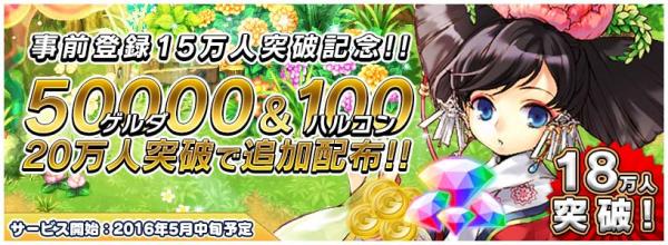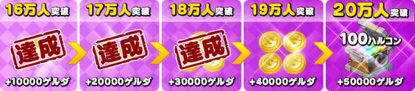 また事前登録20万人突破を目指して、15万人以降、登録者数が1万人突破するごとに10000ゲルダを追加配布いたします。さらに20万人を突破すると、合計50000ゲルダ+100ハルコンを配布いたします。