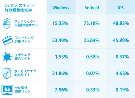 インターネット詐欺の種類別構成比は、ワンクリック・不当請求詐欺サイトが51.99% (前月比1.59ポイント減)、フィッシング詐欺サイトが35.96%(前月比0.28ポイント減)、マルウエア感染サイトが0.92%(前月比0.12ポイント増)、ボーガスウエア配布サイトが8.05%(前月比0.70ポイント増)、ぜい弱性悪用サイトが3.08%(前月比1.05ポイント増)でした。