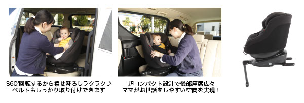 さらにシートが360°回転するので、お子さまの乗せ降ろしもラクラク。本体も超コンパクトなので後部座席を広々と使うことができます。お出かけがもっと楽しく、もっと楽になるアイテムです。