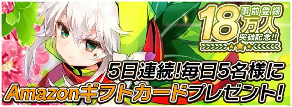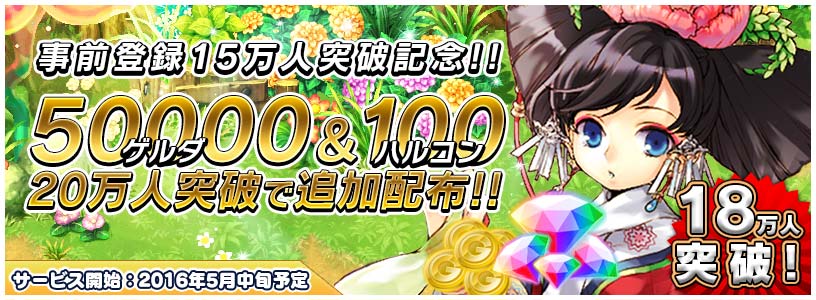 また事前登録20万人突破を目指して、15万人以降、登録者数が1万人突破するごとに10000ゲルダを追加配布いたします。