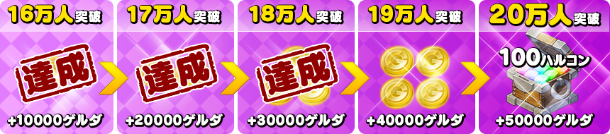さらに20万人を突破すると、合計50000ゲルダ+100ハルコンを配布いたします。