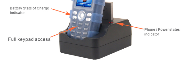 充電クレードルに電話機が入ったままでもダイヤルキーに操作が可能で、充電時間は約2時間となります。バッテリー充電の状況は充電器側にLEDに表示され、また電話機側のスクリーンで充電のプロセスを確認することもできます。