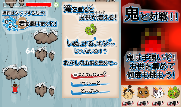 「登れ!! Peach Boy!!」は、画面をタップして岩を避けながら滝を登る無料カジュアルゲームアプリです。