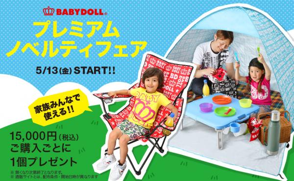 株式会社コージィコーポレーションが運営するベビー・キッズ服ブランドBABYDOLL(ベビードール)がBABYDOLL・STARVATIONS(スターベイションズ)各店、通販各店にて、5月13日(金)より<プレミアムノベルティ★豪華アウトドアグッズプレゼント>を開催します。