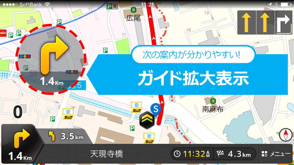 次の指示方向と案内ポイントまでの距離が専用の大型アイコンで表示される機能です。