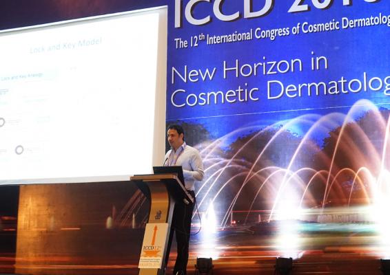インドネシア・ジャカルタで開催された「The12th International Congress of Cosmetic Dermatology」(第12回 国際美容皮膚科学会)にDr.アーメッド・アルカタニ(米国AQ Skin Solutions社代表)が参加し、GF(グロースファクター=成長因子)での治療、スキンケア製品への応用について、学術発表を行った。講演会場は満席状態で、数多くのドクターが耳を傾けた。また、学術発表の中で、既にインドネシアでAQ製品を使った治療結果や画像など、実践的なエビデンスが多数、掲載されており、大変大きな説得力をもって学術発表を行った。