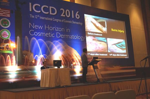 インドネシア・ジャカルタで開催された「The12th International Congress of Cosmetic Dermatology」(第12回 国際美容皮膚科学会)にインドネシアのDr.Danu Mahandaruが米国AQSkinSolutions社のリカバリーセラムとアクティブセラムを使用した、成長因子での治療の有用性について学術発表を行った。講演会場には多くのドクターが集まり、Dr.Danu Mahandaruは成長因子治療の有用性を大々的に発表し、多くの賛同を得た。