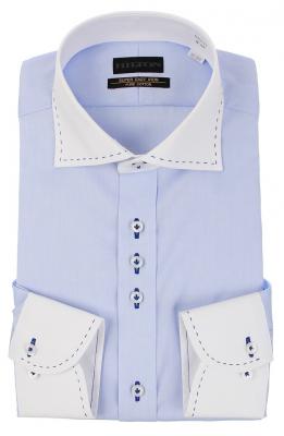ドレスシャツは明るいブルー色で、衿と袖口部の「クレリック仕様」や胸元に配した「3連ボタン」などデザインにもこだわりました。ネクタイは優雅な光沢をもつ上質なシルク生地を使用し、落ち着いた印象のネイビー色で企画しました。