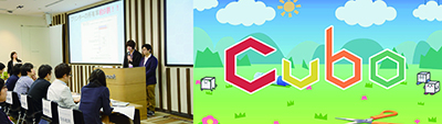 上画像:プレゼンテーションの様子と『Cubo(キューボ)』ゲーム画面