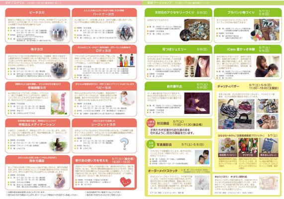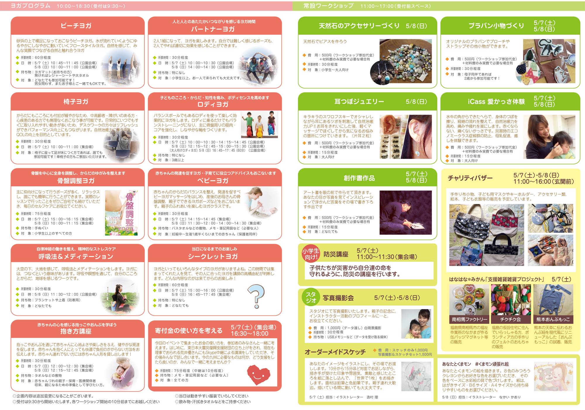 内容 | ビーチヨガ、椅子ヨガ、RODYYOGA、ベビーヨガ、抱き方講座、パートナーヨガ、骨盤調整ヨガ、天然石、プラバン、耳つぼ、愛かっさ体験、 バザーの開催、現地との中継、講演会、小学生向け防災講演、写真撮影、オーダーメードスケッチなど。