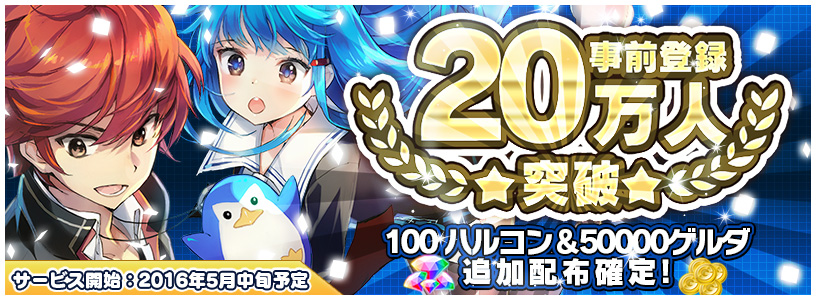 また事前登録20万人突破記念として、合計50000ゲルダ+100ハルコンの配布が確定いたしました。