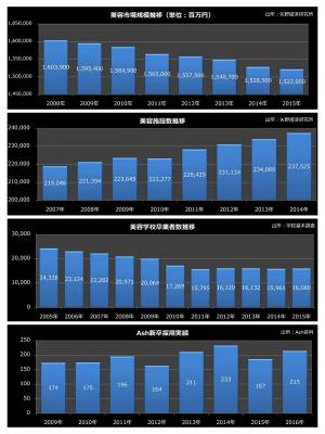 美容業界においては、節約志向から来る来店サイクルの長期化、低価格サロンの台頭などによる単価の下落等の理由から市場規模が微減推移しています。一方、美容室件数は依然増加傾向にあり、顧客獲得のためのサロン間の競争が激化しております。また、美容師を志望する学生は2005年をピークに減り始め 美容学校の卒業者数は2005年からの10年間で約24,000人から16,000人と約66%減少しております。