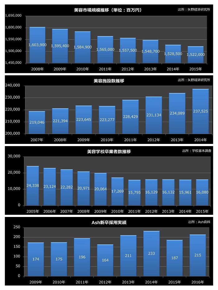 美容室は増加し、美容学生が減少していく傾向にあるため サロン間の採用競争は激化してきております。“人が財産”と考える株式会社アッシュでは、以前より採用力の強化に注力しており、全国の美容学校約270校へ学校訪問を行い、多くの採用実績を積んでおり、新卒者の採用は安定しております。