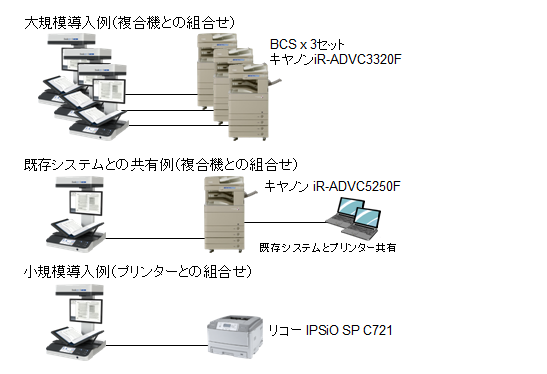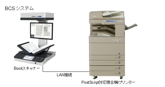 「Book Copy Station シリーズ」はPostScriptを使用した印刷機能を搭載しPostScripに対応可能な複合機/プリンターであれば柔軟な接続を可能としています。 また、お客様の環境には既に複合機/プリンターをお持ちの場合が多く、新規に「Book Copy Station シリーズ」専用の複合機やプリンターを購入しなくても、既存設備を利用して上向き上向きのブックスキャナーを使いたいというご要望も多くいただいております。