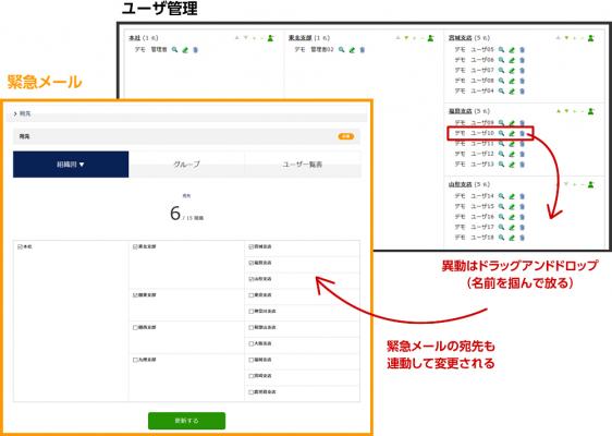このご要望にお応えし、組織図(ユーザ管理)で社員の異動が合った場合、一斉配信の宛先も自動で変わるよう機能追加を行いました。これにより、組織図と緊急メール両方の編集を行わずとも、組織図のみ変更すれば管理ができるようになります。