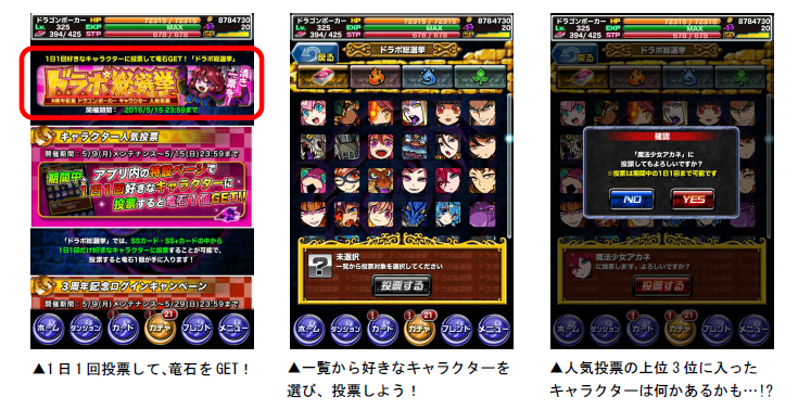 竜石が毎日もらえる「3周年記念ログインキャンペーン」、キャラクターの人気投票を行なう
