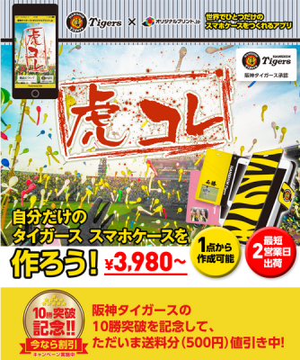 誰にでも簡単にオリジナルデザイングッズが作れる「オリジナルプリント.jp(http://originalprint.jp/)」 を運営する株式会社イメージ・マジック(本社:東京都板橋区、代表取締役:山川誠)と販促ソリューションをトータルに提供する株式会社CDG(本社:大阪 市北区、代表取締役社長:大平孝)の共同事業としてリリースした阪神タイガース承認 iPhone手帳型ケース作成アプリ「虎コレ」。ご好評を頂いてる中 2016年5月10日から「10勝突破記念キャンペーン」として送料にあたる500円のプライスダウンを実施しました。