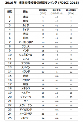 アメリカ地域: 米国は4年連続で首位を維持している。米国市場に関心を持つ海外投資家は広範にわたるが、米国への海外直接投資の大部分を占めるのは、日本、カナダ、中国である。カナダは、海外直接投資信頼度指数の順位を一つ伸ばし、3位となった。カナダ投資法のもと、民間部門の海外投資の純便益には政府の審査が必要となるが、待望の改正により対象が縮小されたことで、カナダの海外直接投資先としての魅力が高まっている。ラテンアメリカ地域で、2016年の海外直接投資信頼度指数ランキングにランクインした国はブラジルとメキシコのみだが、両国とも大きく順位を落としている。