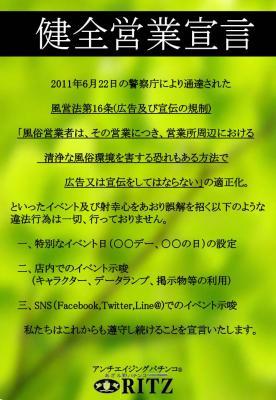 2016年5月10日アンチエイジングパチンコ(R)RITZが健全営業宣言をしました。