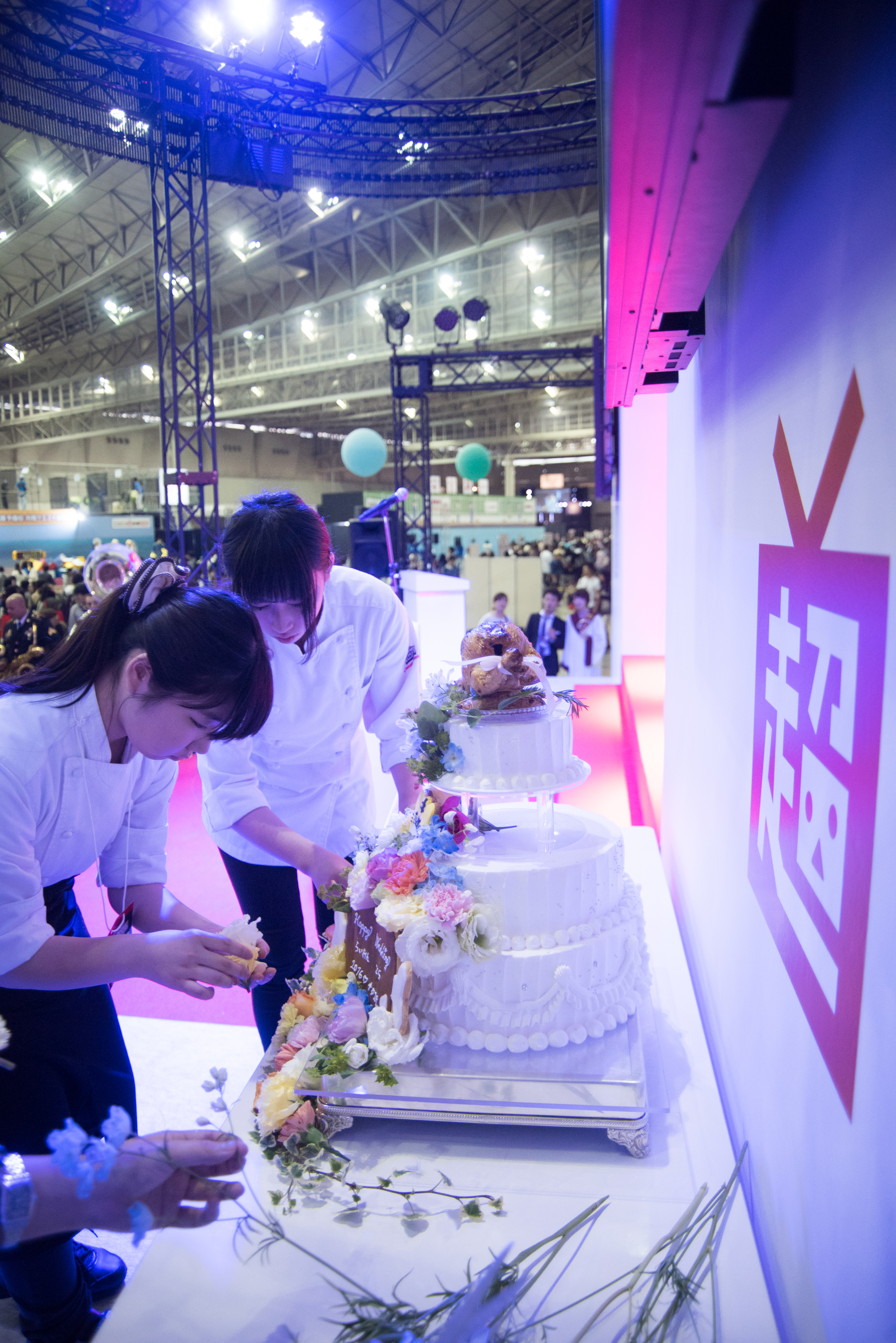 文化祭として『超フードコート』で”超パンケーキ”や”超ホットドック”を作って販売する学生もいる一方、『大和超券ステージ supported by 大和証券』で行われました『超ニコニコ結婚式』では、バンタン高等学院の学生がウェディングケーキを作りセッティングした他、ステージ上の新郎新婦の挙行サポートなども行いました。