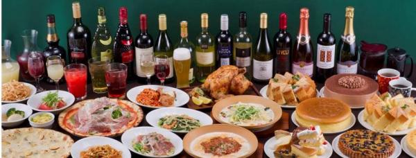 パスタ20種・ピザ8種・ロティサリーチキンプレート・ローストビーフ丼よりお好きなメインメニュー1品とケーキバイキング、サラダバー、ドリンク飲み放題がついて、1,280円(税抜)からとご利用しやすい料金設定といたしました。