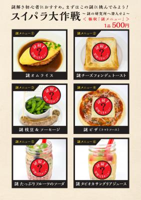 様々なスイーツやパスタなどの食べ放題を堪能しながら、制限時間45分の本格謎解きに挑戦していただきます。(食べ放題は90分制)成功者にはお店で使える特典も……!?人数制限はありませんので、お一人でも複数人でもチャレンジ可能です。予約は必要ありませんので、直接店舗にお越しください。「スイパラ大作戦」の本編以外にも、1つ500円(税込)で小謎付きフードメニューも販売しております。