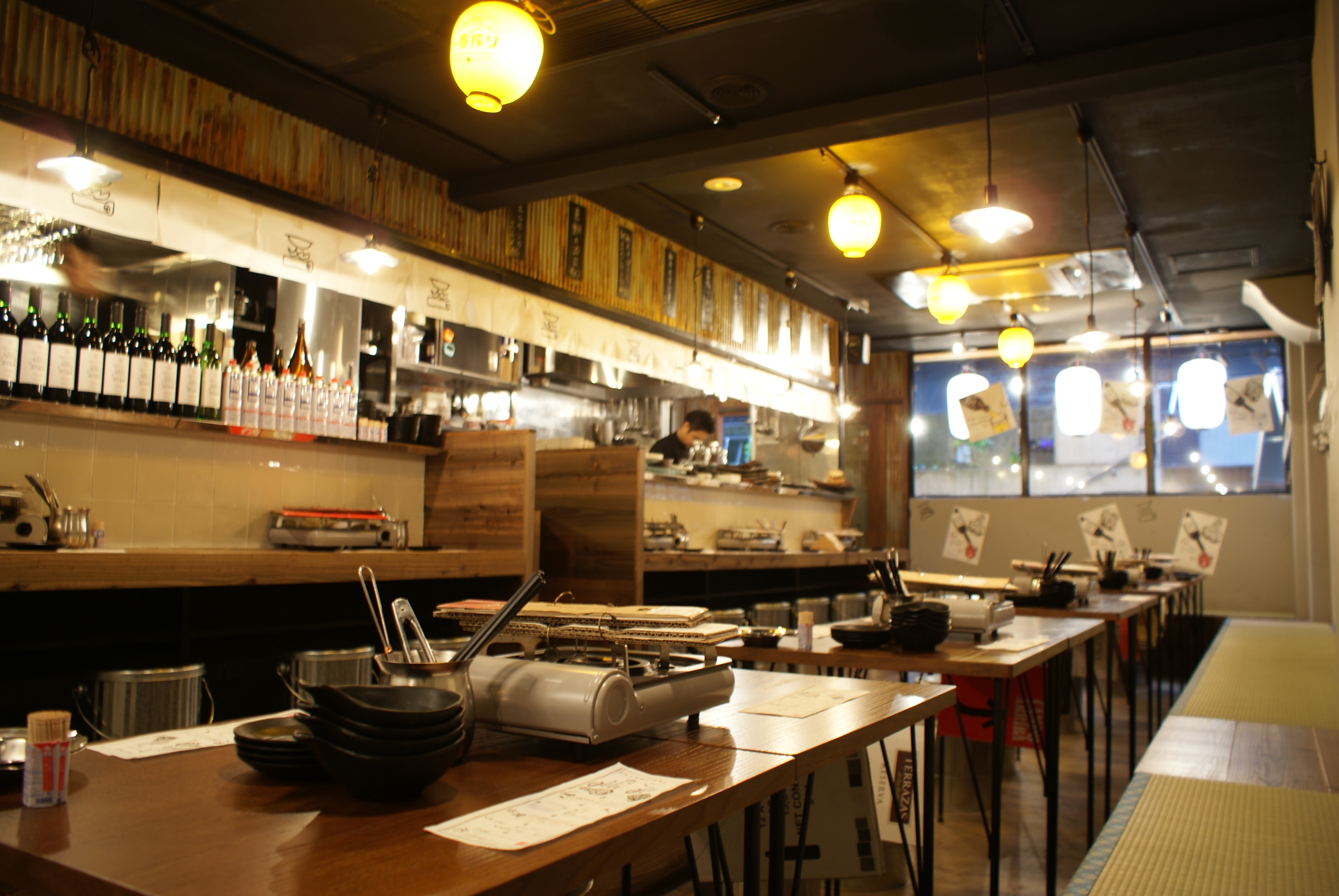 20名の宴会も可能な賑わいのある店内は、「畳のソファー」「段ボール製のメニュー」「名刺入れを加工したワインリスト」「ガスボンベを模した爪楊枝入れ」「シュールな食べ方のイラスト」など、くすっと笑ってしまったり、思わず写真を撮ってしまいたくなるような遊び心に溢れています。