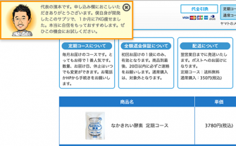 発酵生活では商品をカートに入れたにも関わらず、購入に至らないいわゆる「カゴ落ち」が課題でした。カートに商品を追加した後には、Sprocketガイドで社長のキャラクターを表示し、商品の効能や体験談などを伝え、購入のもう一押しをしました。結果、表示しない場合に比べて購入完了までに至った割合は123%となりました。
