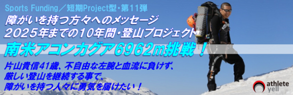 これは、通常の短期瞬間型のクラウドファンディングではなく、資金難のマイナー競技アスリートが中長期持続型で資金調達を目指す“スポーツファンディング”としてサポートするもので、「常時後援会型」と「短期プロジェクト型」の2タイプある内、後者の第11弾として、障がいを持ちながらも過酷な登山に挑戦し続ける、登山家・片山貴信の今後10年計画の第1章として、2016年12月の南米最高峰・アコンカグア登頂に挑戦に向けて、資金協賛(小口ミニスポンサー)の募集を開始致します。