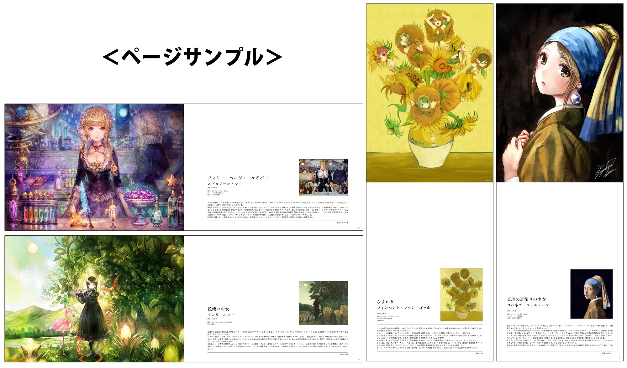 クールジャパンの一端を担う絵師たちが描くイラストと共に、元となった名画・解説テキストも掲載しています。世界で愛され続ける名画と、現代風にアレンジされたイラストを、見開きで見比べることができるのも本書の見所のひとつ。美術史年表やコラムも充実し、読み応え抜群です。