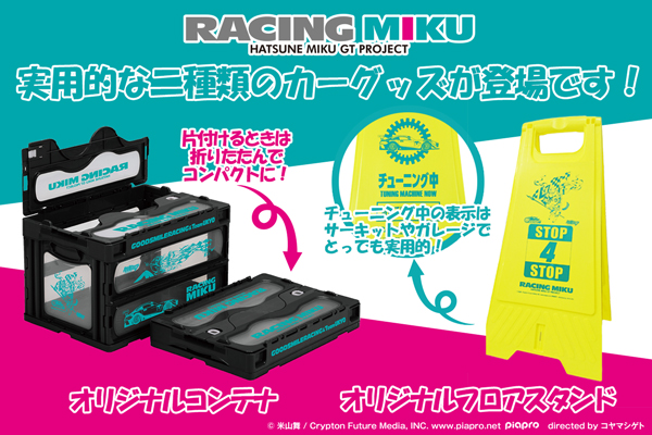 ココラボにて『レーシングミク2016Ver.』第三弾のグッズ公開となる今回は、カー用品の収納やイベントで便利な「オリジナルコンテナ」、ガレージ・野外でのメンテナンスに活用できる「オリジナルフロアスタンド」と、車好きにフォーカスした実用的なラインナップとなっております!