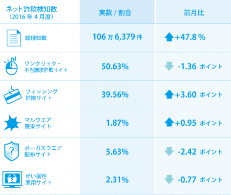 BBソフトサービス(BBSS)の「Internet SagiWallTM(インターネットサギウォール)」で検知したデータを基にした、 2016年4月度のインターネット詐欺リポートです。