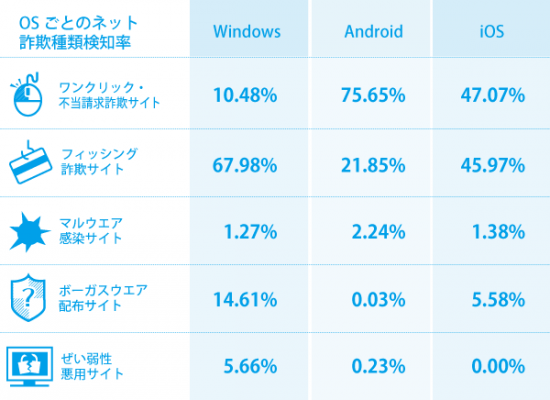 OSごとのネット詐欺種類検知率