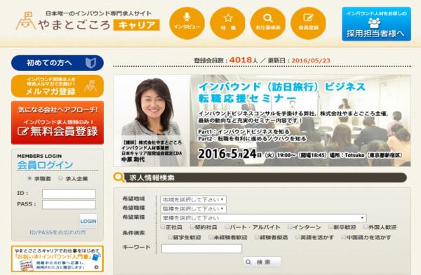 「やまとごころキャリア」とは、「日本のインバウンドを熱くする」をモットーとするやまとごころが、人材を募集したい日本全国のインバウンド関連企業と、インバウンド業界で働きたいという求職者を結ぶ日本初のインバウンド業界に特化した人材マッチングサイトとして2014年6月に開設したものです。本日(2016年5月23日)現在の登録企業数は260社以上、求人情報数は常時120件以上となり、サイトの開設から2年未満で求職者の登録が4,000名に到達しました。