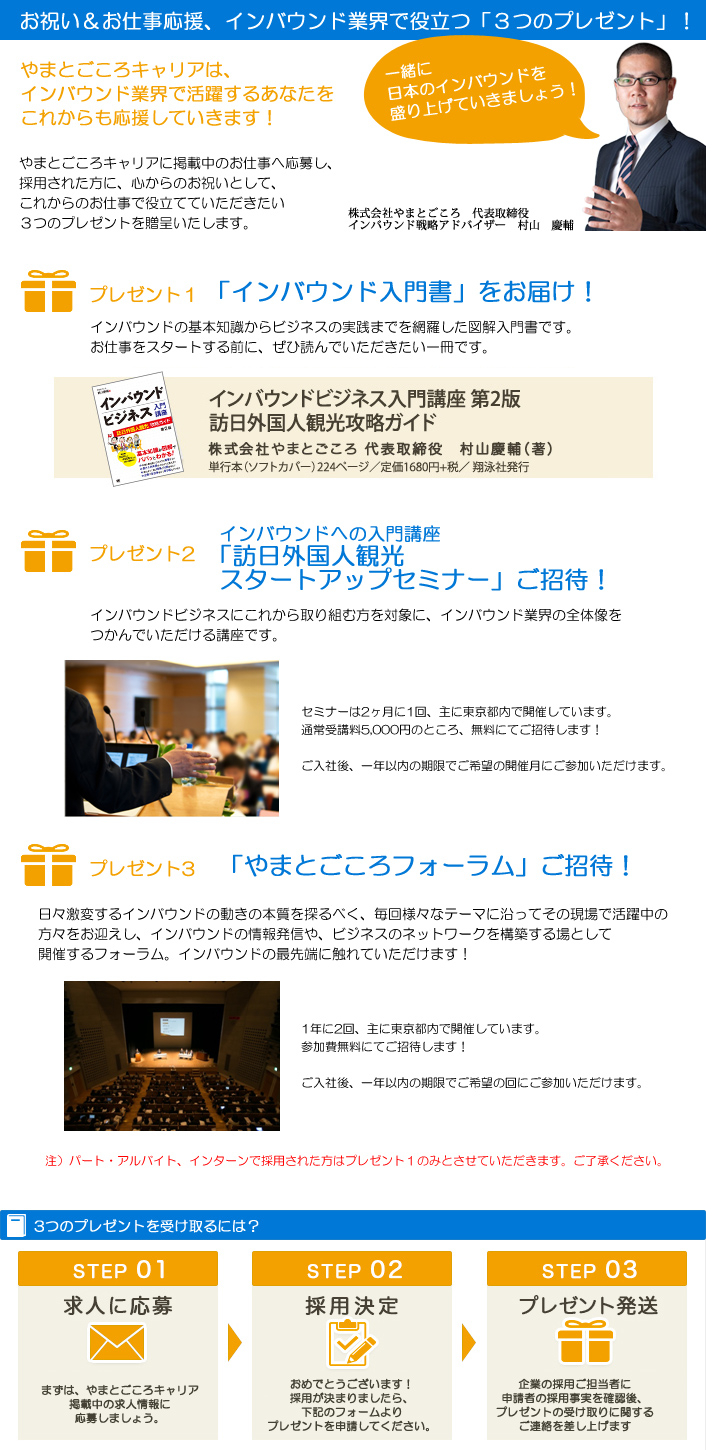 このたびの会員登録者4,000名突破を記念して、就職お祝いの特典をリニューアルします。「やまとごころキャリア」を通して採用が決定した方には、これまでもお祝いとして「インバウンド入門書」をプレゼントしていましたが、今後は特典をさらに拡充。就職後にインバウンド業界で活躍いただけるよう、やまとごころ主催の研修ならびにフォーラムに無料でご招待します。