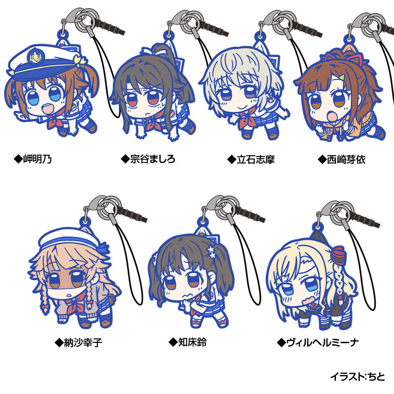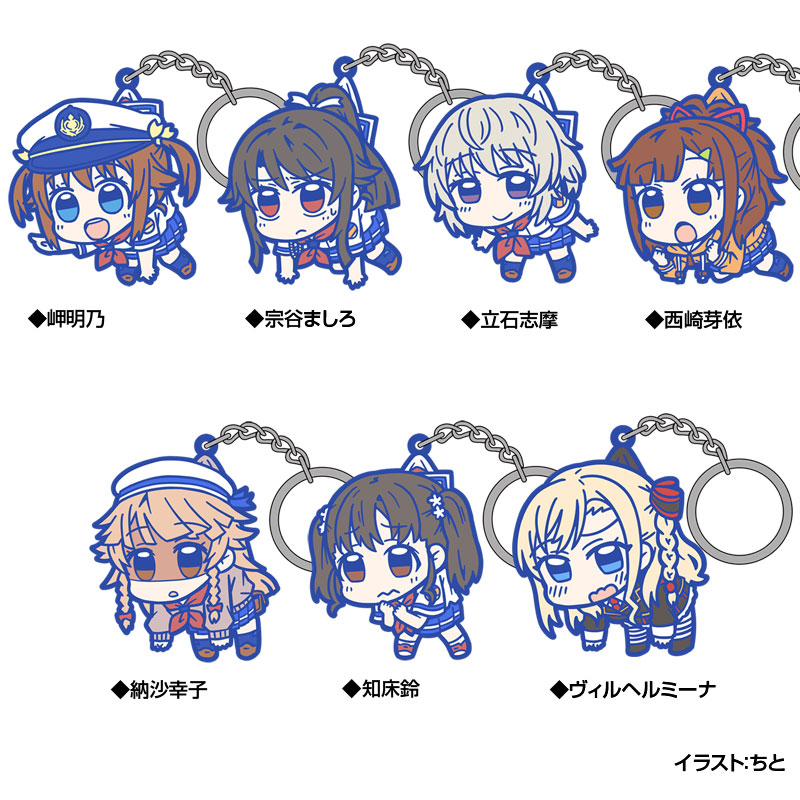 TVアニメ『ハイスクール・フリート』より、 "明乃・ましろ・志摩・芽依・幸子・鈴・ヴィルヘルミーナ"の7人が、コスパオリジナルのラバーキーホルダー&ストラップ「つままれシリーズ」に新登場! ちと氏による描きおろしイラストを使用し、デフォルメされたそれぞれのつままれた時の リアクションが可愛いアイテムです!