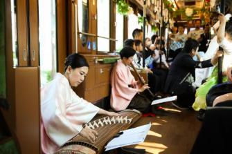 箏や尺八など和楽器での生演奏が響きわたる中、新郎新婦と一緒に考えたオリジナル挙式を執り行い、挙式後は車内での記念撮影や招待状に同封したオリジナル切符にスタンプを押すなどの演出と共に、終点の荒川車庫前駅で下車するまでゲストの方々と貸切列車を楽しんでいただき、荒川車庫にて電車をバックに全員での集合写真を撮影、ゲストにとっても思い出深い結婚式になったと思います。また、「都電ウエディング」の後は、都内の懐石料理店に移動して披露宴を行いました。