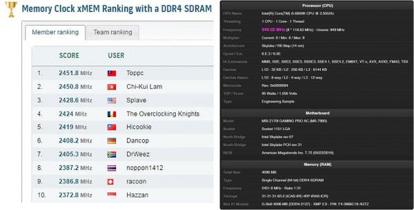 2016年5月25日-Micro-Star International Co. Ltd., 台湾・新北市- マザーボードの設計で世界をリードするMicro-Star International(MSI)は、MSIのIntel Z170チップセットをベースとしたもっともパワフルなMini-ITXマザーボードが、DDR4メモリクロックの世界記録を更新したと発表しました。オーバークロッカーの"Toppc"は、G.SkillのDDR4 4GBメモリを使って、4903.6MHzというメモリクロック1位の記録を樹立するとともに、メモリクロックとしては過去最高の記録を達成しました。この世界記録は、コンポーネントの歴史においても5000MHzに迫るというマイルストーンとなるもので、MSIのZ170における圧倒的な性能の高さを示すものです。