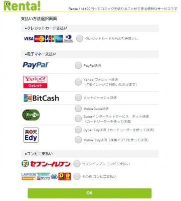 ●マルチデバイス対応電子書籍サイト「Renta!」の支払い方法一覧